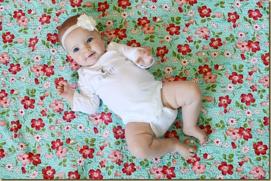 When you lay her down on her back she flips over as quickly as possible. It took So.Many.Tries to get this picture. She now confidently can roll both ways, but really only flips from tummy to back in her bed, because anywhere else she just wants to be on her tummy and moving!